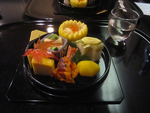 19:49 八寸 お造りを食べ終えたところで、続いて”八寸”。 八寸は、かに酢、鯛寿し、海老うに焼、厚焼玉子、栗、数の子山葵漬などが彩りよく盛り込まれています。 どれもお酒の肴に合いますね。 (^_^)v 和食は、四季折々の食材を料理して食べさせる訳ですが、特に初物が尊(たっと)ばれます。 その季節を感じさせるために、この料理だと紅葉したモミジなどが添えられています。 今時期であれば、紅葉したモミジが手に入りますが、まだ紅葉したモミジが手に入らない初秋においても季節を感じさせるために紅葉したモミジを添えたりします。 それは、1年先にお客さんに提供する料理のために前年に紅葉したモミジを保存しておいて使うこともあるそうです。(これは他のところで聞いた話です。) |