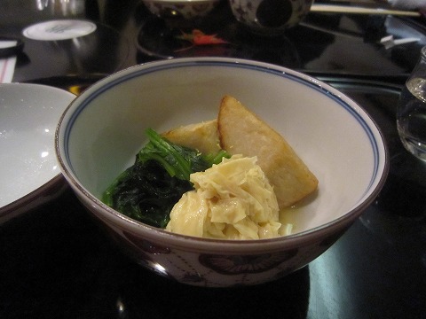 20:12 煮物 焼物の後は料理の最後、炊き合わせで、海老芋、湯葉、法蓮草。 これも”お椀”と同じ様に、出汁が効いていて美味しく出来上がっています。 元々素材が持っている味と、出汁の味が重なって、美味しさを倍増させているようです。 普段自分が食べているお店とは、ちょっと手間のかかり方が違うのが予想できます。 炊き合わせを食べてみた感じ、それぞれの素材で違う煮方をして、一つの器に盛っているようです。 海老芋のネットリした食感が美味しかったです。 |
