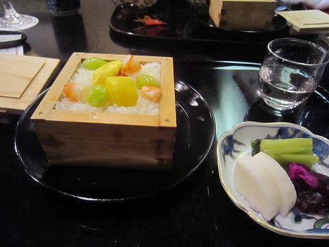 20:21 ご飯 一通りの料理が供されたところで、最後は”ご飯”。 ご飯は”吹寄せ飯むし”。 季節の栗やギンナンを入れたおこわです。 これも季節を感じられ、美味しい。 でも、〆のお椀は付かないんですね。 |