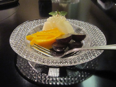 20:40 デザート ご飯を食べ終えたら、最後は季節の果物。 これもただ切っただけではなく、一手間加え、ジュレが添えてあります。 |