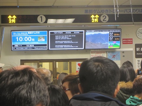 10:16 黒部ダム駅に到着 間もなくしてバスは黒部ダム駅に到着しました。 黒部ダムは富山県の立山町に位置します。 トンネルを走ってきた間に、バスは県境を越えて富山県側にきたことになります。 黒部ダム駅は地中に作られたバス停です。 珍しがって写真を撮る隣国の人々。 それに混ざって一緒に写真を撮る自分=日本人。(笑) |
