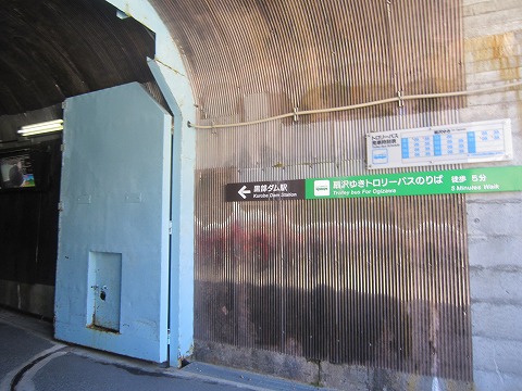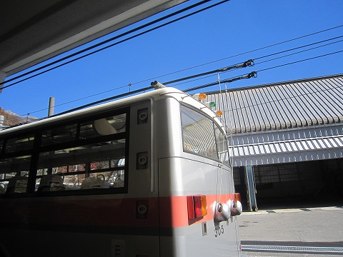 10:01 発車オーライ 10時の定時になってバスは発車オーライ。 出発してすぐ急カーブの急勾配を登り、車両基地の裏側へ。 まもなく、バスは関電トンネルに突入します。 黒部ダムに向かうトロリーバスは架線から給電を受けて走る電気自動車です。 黒部ダムとここ扇沢を結ぶ関電トンネルは、延長はおよそ5kmほどです。 この工事用に掘られたトンネルの断面形状は必要最小限度の大きさにしかないため、トンネル内でバスは離合できず、決められたダイヤで交互通行によりバスは運行されています。 トンネルは狭小で内部には換気設備を設置するスペースが確保できないため、排気ガスを排出しない電気式のトロリーバスが使用されるんですね。 |