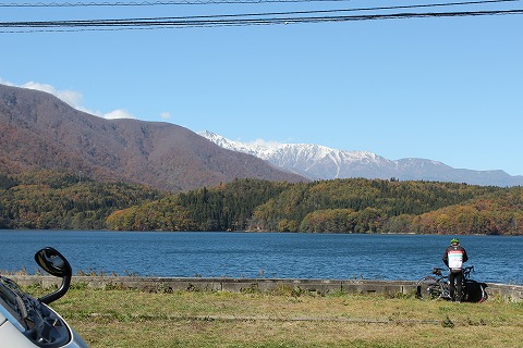 12:34 青木湖 国道148号線から少し入って、青木湖に到着しました。 背景の少し雪化粧した北アルプスの山々が綺麗です。 ところで、お腹が空いたんですが・・・・。 「う〜ん。自然ゆたか過ぎて、人工物(お店)が見当たらない! (笑)」 |