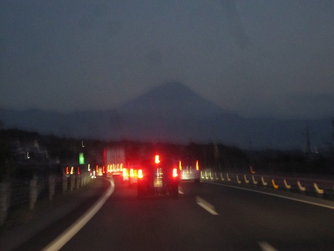 17:20 中央道を東進 長野自動車道から岡谷JCT経由で中央自動車道に入り東進中。 薄暮の中、正面に富士山が見えて、クルマは長野県から山梨県へ。 |