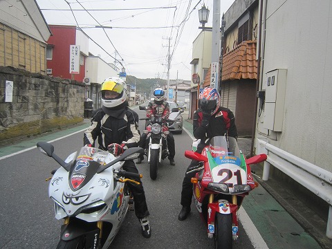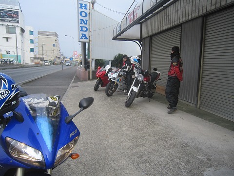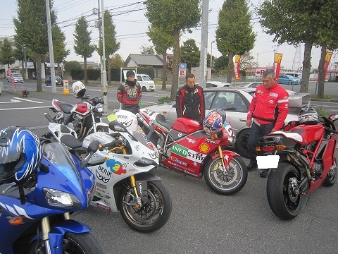 9:46 全員集合 千葉県内ツーリングのときのいつものパターン、K2Yを出発し、千葉市若葉区小倉町あるESSOのスタンドまでやってきました。 ここで、いつもの様にドカの岩井さんと合流。 参加のメンバー5台全部そろいました。 内訳はドカが3台、HONDAが1台にYAMAHAが1台、ドカ率高いですね。 ( ̄。 ̄;) |