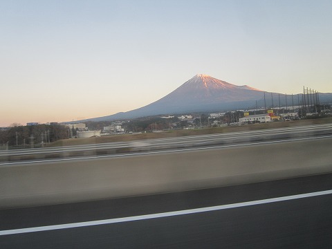 6:50 紅富士 新東名高速を西走中。 さっきから右側の窓に富士山。 朝日があたり、紅に染まった富士山がきれい。 仕事や鈴鹿サーキットでちょくちょく西に行く自分には見慣れた景色ですが、姉と母親は車内で大騒ぎ。(笑) |