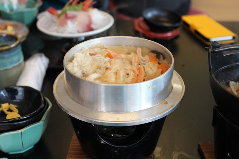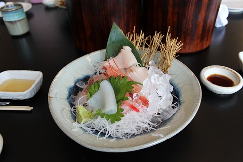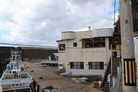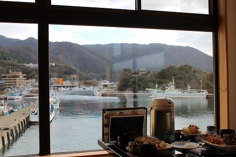 12:20 席が空きました。 20分強待って先のお客さんの食事が終わり席に通されました。 自分たちが案内されたのは、座敷の席で6人がけのテーブルが4卓ほどあります。 大きな窓からは、漁港を見ることが出来て、旅行感を満足させてくれますね。 少々残念なのは、大きな堤防があって、外海が見えないこと。 自分たちが通された部屋の他にも部屋があり、掘りごたつ形式の席もありました。 まだ足首が自由にならない自分は、座れる掘りごたつ形式の席の方が良かったのですが、満席でした。 |