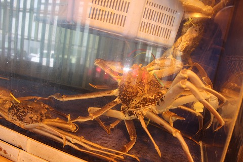 12:03 ウェイティング 水槽では、自分たちに食べられるであろうカニがお待ちしております。(笑) 腕に付けられた黄色いタグがブランド蟹”越前ガニ”の証。 敦賀インターに到着したときに、事前に電話をして12時からの席順を取っておいてもらいましたが、只今満席でウェイティングです。 自分たちが席が空くのを待っている間も次々に飛び込みでお客さんがやってきたので、事前に電話をしておいて正解でしたね。 |