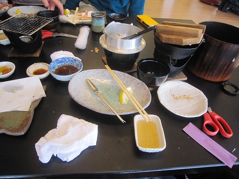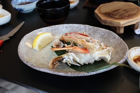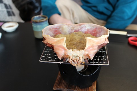 13:04 焼きガニ カニの料理も、刺身→茹で→しゃぶしゃぶ、と来て、4足めは、焼きガニ。 焼きガニは、香ばしくて、身がホクホクして美味い。 ただし、身が甲羅にくっついて食べにくいのが欠点だね。 甲羅に残った身が勿体ない、勿体ない。(>_<) |