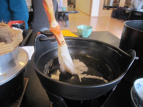 12:53 カニしゃぶ 続いて、カニしゃぶ。 昆布だしの利いたお湯の中をくぐらせると、カニの身がフワッと広がってきれいです。 基本熱を加えると、甘みが増しますね。 |