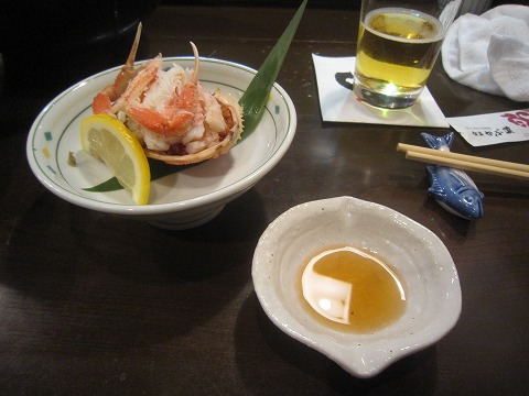 19:41 香箱蟹 一番混んでいる時間帯の満席時に入ったので、供される料理もちょっと遅め。 まずは、香箱蟹。 昼間、食処えちぜんで姉がこうばこがに丼を注文していたんだけど、自分のところまで回ってきませんでした。(笑) カニは既にばらしてあって、食べやすい。 味が濃くて美味しいですね。 関東ではまずお目にかかることがありません。 香箱蟹は越前ガニのメスで、漁期が11月初旬から年末頃までと短いらしく、今回食べられてラッキー。 (^_^)v |