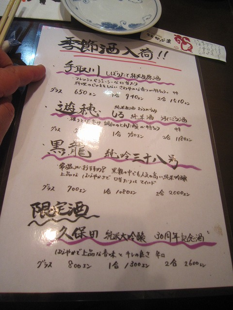 19:48 お薦めのお酒 日本酒はこのお薦めのお品書きから、久保田は地元じゃないんで外して、1号ずつ順番に呑んでいきます。(笑) と言うことは、少なくとも3号は呑むって言うことだね。 (゜o゜;) |
