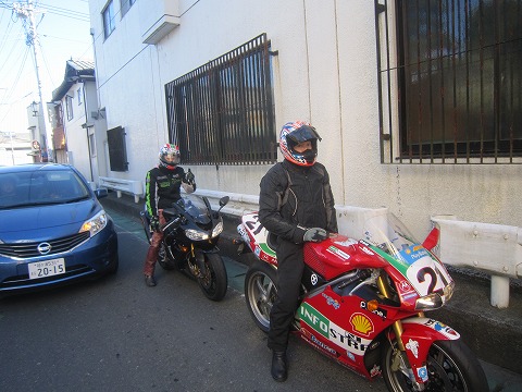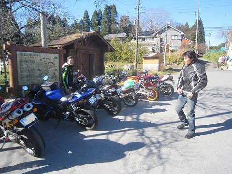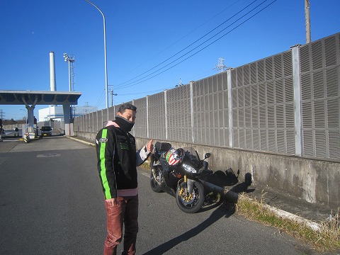 9:12 初参加メンバー 千葉北インターに到着すると、今日初参加メンバーのさきょーくん、すでに到着してました。 『明けましておめでとう。 今年もよろしくね。』 さきょーくんは、鈴鹿のレース観戦とかで自分のホームページに時々顔を見せている愛知県在住。 昨日の大晦日にイベントを見たくて関東にやってきて一泊。 せっかくなので、K2Yの元旦ツーリングに参加することになりました。 |