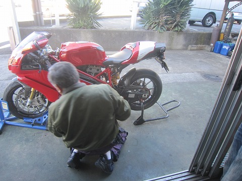 9:37 準備中 アイスエイジさんは、今日のマシン749Rの整備中。 ステップの位置を変更しているみたいです。 『明けましておめでとうございます。』 |