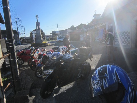 14:13 途中休憩 鴨川の海岸線からすぐに内陸に入り県道82号天津小湊夷隅(あまつこみなといすみ)線を北上。 途中から、県道177号勝浦上野大多喜線に入り北上を続け、船よしからおよそ40分、いすみ鉄道の大多喜駅前まで戻ってきました。 途中、県道177号線では久しぶりに先頭を走りましたが、肩の状態はまだまだでですね。 長い時間ライディングをしていると、力が入らなくなってきてしまいます。 前回の勤労感謝の日ツーリングの後半は全然力が入らなくなってしまったので、今回は途中で「休憩を入れてね。」とお願いして、ここ大多喜駅前で休憩をしました。 自分が先頭を走っている間、アイスエイジさんはさきょーくんのライディングを観察、ここで休憩中に色々とアドバイスをしていました。 きっと、いい勉強になるね。 |