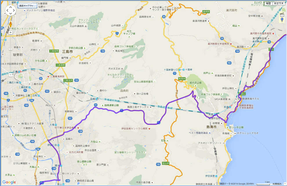 11:45 熱海から 真鶴道路で南下した後、再び国道135号線に戻り南下。 その先、熱海までは”熱海海岸自動車道(通称:熱海ビーチライン)”がありますが、国道の方が空いてそうなので、否、小銭を出すのが面倒なので、そのまま国道135号線を走り熱海の市街地までやってきました。 熱海の市街地からは、東伊豆の海岸線にサヨナラして、静岡県道11号熱海函南線(あたみかんなみせん)で内陸側に針路を取ります。 |