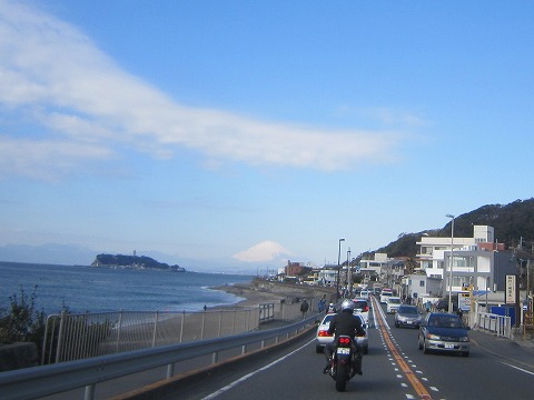 10:01 稲村ヶ崎から ガソリンを給油した後、逗子から相模湾の海沿いを走る国道134号線を西走。 鎌倉の稲村ヶ崎を通過すると左前方には江ノ島、その向こうに富士山が見えてきました。 (写真だとボンヤリですが、肉眼だともっとはっきり見えますよ。) |