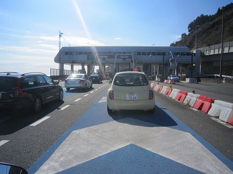 11:05 石橋料金所 真鶴道路方面に進路を取り、西湘バイパスを南下し、しばらく走ると”石橋”の料金所に到着しました。 夏場であれば道路が混むので、ツーリングでこのルートは選択しませんが、冬場なので混んでいないと思いこのルートを選びましたが、ハズレ! ちゃんと渋滞してました。(>_<) この先の信号で詰まっちゃってるんで、ETCのゲート内も渋滞中。 すり抜けもできず、列に並んでじっとガマン。 (ーー;) |