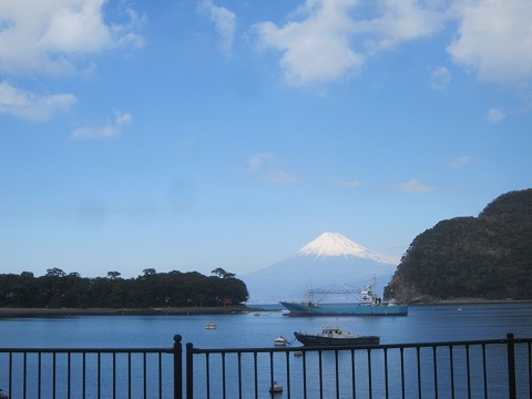 12:44 戸田港から 県道17号線を南下し、戸田の市街地を少し離れると左手に戸田湾を構成す御浜崎(みはまさき)。 戸田港の出口の向こうに富士山が顔をのぞかせています。 冬場は視界が良いので、今日は富士山を眺めながら西伊豆の海岸線を走れそうです。 |
