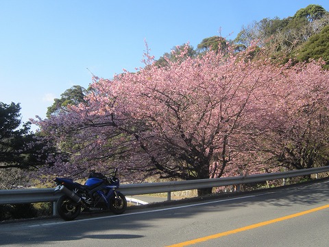 14:39 桜 堂ヶ島を通過し、国道136号線を北上中、道路脇に咲く桜が目に入りました。 (ほんとは行きに気付いていたんですけどね。) たぶん早咲きの”河津桜”(かわづざくら)かな。 伊豆でこの河津桜が咲き始めると、春に向かってだんだん暖かい日が増えていきます。 |