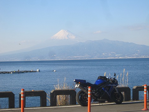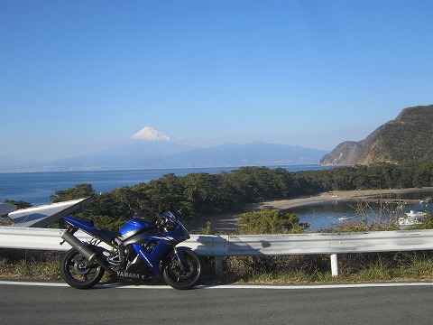 15:19 戸田の高台 河津桜(?)を眺めた後、国道136号線を土肥まで北上し、土肥からは静岡県道17号沼津土肥線(ぬまづといせん)で戸田まで戻ってきました。 行きに写真を撮った戸田港よりちょっと高台で、ふたたび富士山。 国道136号線は道幅が広くて走りやすいけど交通量もそこそこ、県道17号線に入ると道幅はやや狭くなりますが、行きと同様、交通量も少なくバイクで走るには快適です。 |