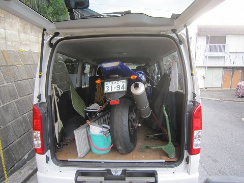 6:52 ツーリングの朝は ハイエースの荷物の積み卸しから。 先週末で年度末の仕事も一段落し、今週の日曜日は時間が取れそうなので久しぶりにツーリングに行こうと考えていました。 すると前日の土曜日、K2Yのアイスエイジさんからタイミング良くツーリングのお誘いメールが届きました。 まずは、集合場所のK2Yまでハイエースで移動ですが、昨日片付けてきた仕事の道具でハイエースは一杯! まずは、この荷物を下ろしてから、R1を積み込むことにします。 |