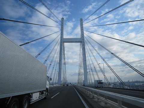 7:49 ベイブリッジの空は 横須賀にある自宅を出発して、国道16号線を北上。 八景島の近くにある幸浦インターから首都高速湾岸線に上がり北上して横浜ベイブリッジまでやってきました。 写真で撮ると雲の合間から青空がのぞいていますが、ぱっと見はやぱりくもり。 |