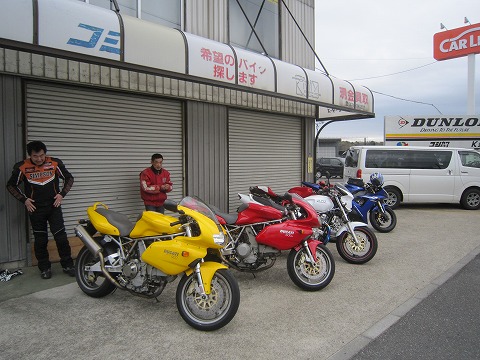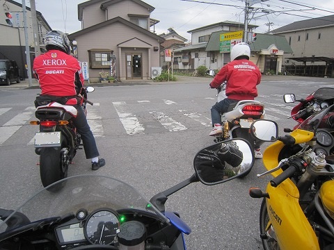 9:06 本日の参加台数 今日参加するメンバーはアイスエイジさん知るのみ。 K2Yではアイスエイジさんを含め5台が集合。 本日の構成は、YAMAHAが2台のドカが3台です。 結局、自分が着たウェアーは、上が3シーズンのジャンパー、下がジーンズの上にオーバーパンツです。 上着の方はいいんだけど、下がダメだ。 自分が持っているのは、今着ているオーバーパンツと、あとはメッシュのライディングパンツだけ。 今時の気温だと、オーバーパンツだと暑くなりそうだし、メッシュのパンツだとちょっと寒い。 この時期に合うライディングパンツが欲しいところです。 |