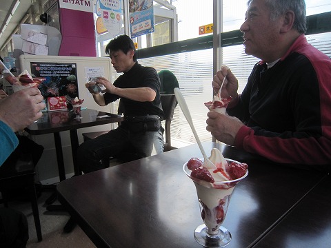 13:25 勝負じゃ! 休憩すれば、ジャンケンは必至。 前回のジュージャンで負けているので、ここで一発逆転を狙い幟(のぼり)にあったシーズンズメニューの”練乳いちごパフェ”を賭けることを提案。 みんなのってくれます。(笑) ジュースジャンケンは急遽”練乳いちごパフェ”ジャンケンに! もう負けるわけには行きません。 以前、ソフトクリームで負けたことは忘れません。 この時点で”練乳イチゴパフェ”値段はだれも知りません。 ( ̄。 ̄;) |