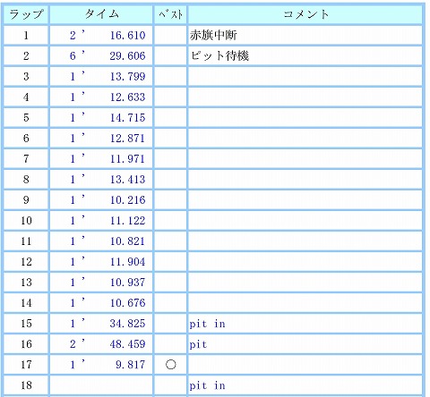 15:07 ラップタイムは? 2本目のタイムもベストは最終ラップで1分8秒299。 一番上の”111.301”って言う数字は、今書いていて何となく気付いたけど、平均速度かな? そして、このアプリだと毎周のデータはGPSレコーダーの方にしか残ってなくて、パソコンが無いと見られないかと思っていたけど、自宅に帰っていじっていたら、毎周のラップはちゃんと記録されていて、見ることができました。 後は、このタイムがどれくらい正確なのか。ですね。 これは、今度エビスの走行会に言ったとき、ポンダーを使ってタイム計測するので、並行で使ってみて、タイム差を確認したいと思います。 |