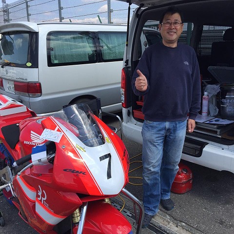 写真を写してもらう 今週末が筑波TTが開催されるため、チーム・ファンデーションの皆さんも練習に来ていました。 飯生さんもお手伝いで来て、いたところを発見されちゃいました。(笑) 自分が写っている写真は少ないので、飯生さんがFBに投稿した写真を使わせていただきました。 m(_ _)m それでは、革ツナギを着てボチボチ走行の準備をします。 |