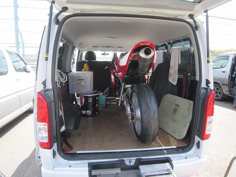 10:24 走行準備 CBRの位置をずらして、ようやくリヤゲートが開きました。 ( ̄。 ̄;) さっそく、CBRをハイエースから下ろして走行の準備をしましょう。 |