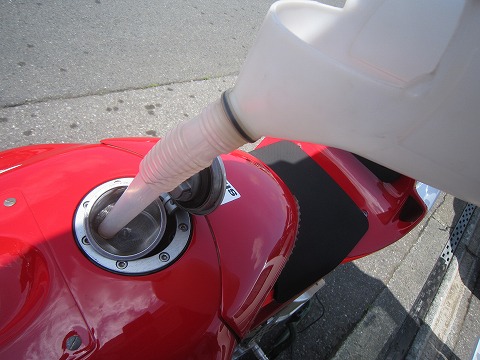 11:09 給油 タイヤの準備とラップタイマーの準備が出来たら、スタンドでガソリンを買ってきて8リットルほど給油。 片手にデジカメを持ち、片手でガソリンを給油していたら、この後こぼしてしまいました。 (^_^;) |