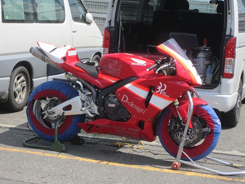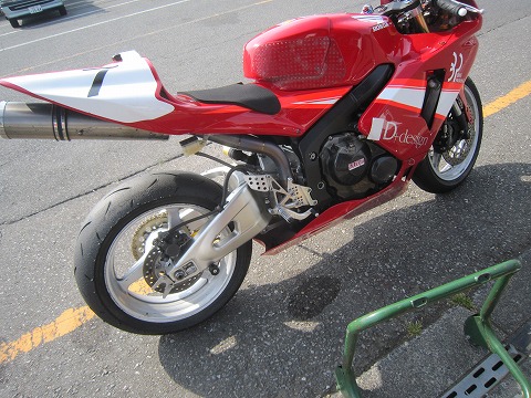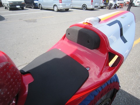 11:41 初走行前に お昼を食べて、バイクのところに戻ってきました。 走行まで1時間ちょっと、タイヤウォーマーをかけてタイヤを暖め始めます。 初走行の前に、バイクの写真を撮っておこう。 傷が付く前に。 (ーー;) バイクのカラーリングは前のオーナーが塗装したのの、そのまま。 なかなか格好イイです。 ポジションのチェックをしたら、自分は体がデカくシートストッパーが当たってしまうので、取り外しました。 |