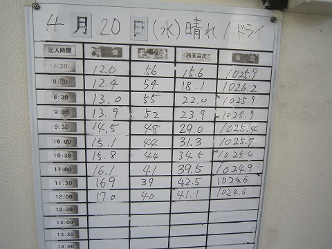 12:28 コンディション 走行前にコースインゲート横にあるホワイト・ボードでのコンディション・チェック。 タイヤのR3コンパウンドの推奨領域は中温の35℃以下ですが、今は40℃くらい。 でも、自分のペースだと、タイヤがオーバーヒートこともないでしょう。 |