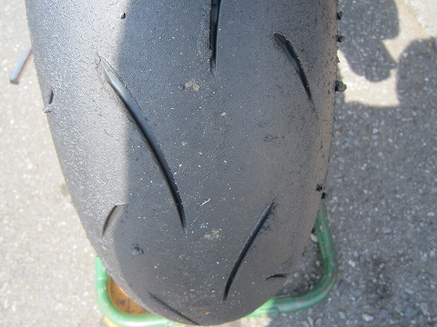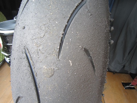 後日のタイヤ 走行後のタイヤの写真を撮るのを忘れていたので、後日ハイエースから下ろす時に撮ってみました。 やっぱり意外に、しっかり端まで使っているんですね。 清水さんの話しでは、体が動かない(体重移動が出来ない)分、同じ様な速度で走るとバイクが寝ることになるみたいです。 まあ、無理はしないで楽しみながら、ボチボチやります。 |