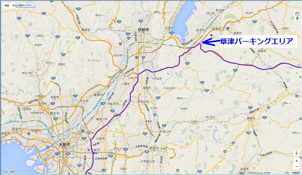 | 草津パーキングエリアを出発した後、名神高速で瀬田東JCTから京滋バイパスへ。 その後、久御山(くみやま)JCTで第二京阪道路に入り南下。 第二京阪を門真JCTまで進んだ後、近畿自動車道で再び南下を続けます。 そして、東大阪JCTへ。 |