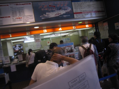 14:55 受付に フェリーは事前にネットから予約。 予約票と記入済の乗船名簿、それに車検証を持って受付にならびます。 代金はネットから予約してカード決済なので代済です。 |