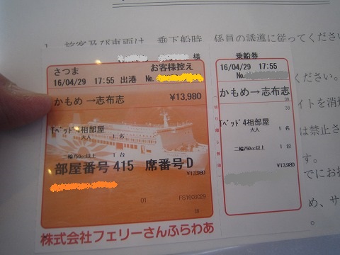 15:01 乗船券 乗船手続きが終わりました。 予約したフェリーは、”大阪南港発 鹿児島県の志布志行き”です。 大阪や神戸からは、九州の各地にフェリーが出ていて、関東の人間からすれば羨ましい限りです。 前回2006年に九州ツーリングに行ったときには、神奈川県の横須賀からフェリーが出ていましたが、残念ながら今はその航路は無くなっちゃています。 予約した席(?)、部屋は2段ベットの4人相部屋です。 お値段は大型バイク(750cc以上)込みで¥13,900(片道)と自走するよりお得です。 出航は17:55の定刻予定で、乗船開始は連休初日に混み合っているので、 いつもより早く出港1時間半前の16:30頃から開始されるとのことでした。 |