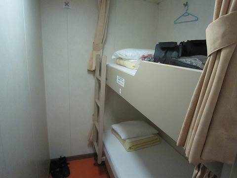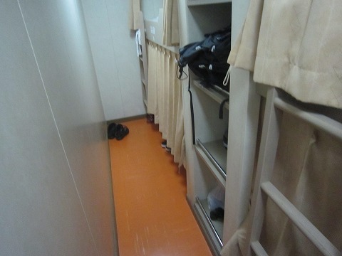 17:01 寝室は 予約した寝室に着きました。 自分が予約したのは、4人ベット相部屋。 ベットは2段で自分は上段でした。 はしごを使って上段に上がるのはちょっと面倒です。 希望が出来れば下段の方がよろしいかと。 ベットはカーテンで仕切られているだけ、4人ベットと言っても部屋ではなくこちらも入口はカーテンで仕切られているだけ。 なので、プライバシーはイマイチ、セキュリティーに関しては無いと思った方がよろしいかと。 セキュリティーが心配な人は、ロビーにコイン式のセキュリティーボックスが数量限定ですがありました。 プライバシーとかが気になる人は、お金がかかりますが、個室をどうぞ。 |
