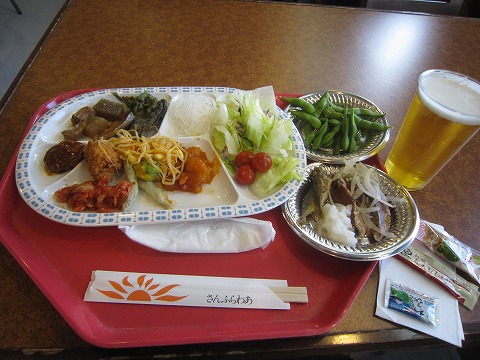 17:59 夕食 たくさんの人が並んだこともあり、予定より早く開店。 レストランはブッフェ・スタイルで、大人お一人様\1,540-。 思ったより色々な種類があって、カツオのたたきなんて刺身もあって結構充実してます。 もちろん、生ビールは別で、\500。 と船上のレストランとしては良心的な価格設定ですね。 それでは、夕食の時間としてはちょっと早いですが 『いただきます!』 |