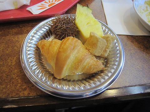 18:39 とりあえず 最後にデザートを。 熱帯のフルーツ、ランブータンがありました。 珍しいですね。 それに、パイナップルとなぜかきな粉餅。 デザートテーブルの横にパンが何種類か置いてあったので、クロワッサンで味見をしておきます。(笑) |