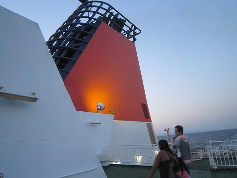 18:47 デッキに 夕食を食べたら、ちょっとデッキに出てみます。 夕方の風が気持ちいいですね。 以前は真夜中でもデッキに出られたと記憶していますが、今はデッキに出られるのは、日没までと日の出から。 夜中、真っ暗の中、海に落ちちゃうと行方不明になっちゃうからね。 |