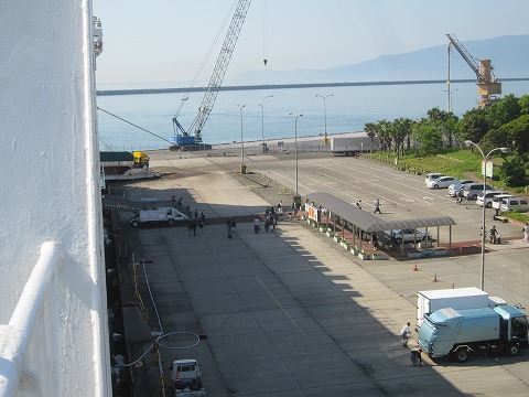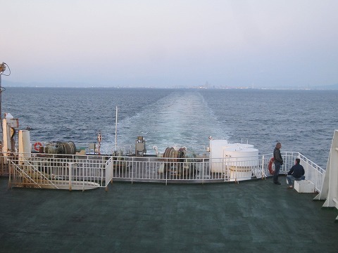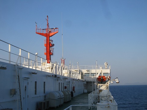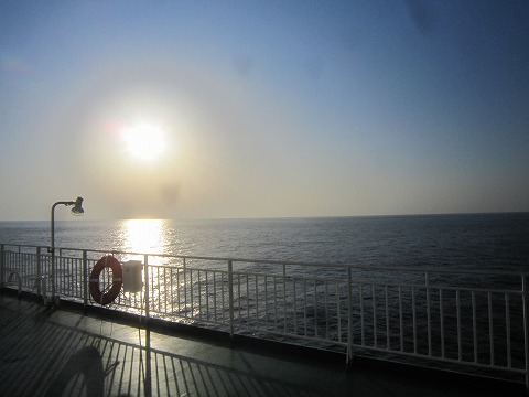6:27 朝目を覚まして 夜中にたまに船がグググッと揺れて目を覚ますことがありましたが、航海は波もなく快適。 6時過ぎには目を覚ましました。 もう少し寝ていてもいいんですが、もう十分寝たので(加齢で寝ていられなくなったと言う話しもあります)、ベットから起きてデッキへ。 デッキに出ると、流石にTシャツ一枚だと、少し肌寒く感じます。 それでも、この時間でTシャツ一枚で居られるのですから、このまま日中になればかなり暖かくなりそうです。 |