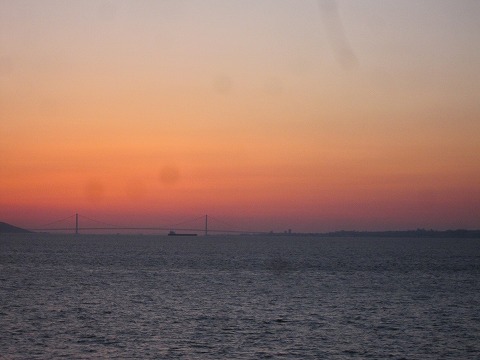 18:48 明石海峡大橋 フェリーの右舷、西側に回ると、夕焼けの向こうに、明石海峡大橋が黒く影を落としています。 大分や北九州行きのフェリーは大阪湾を出てあの明石海峡大橋の下をくぐり瀬戸内海を西に航行していきます。 対して、志布志行きのこのフェリーは、和歌山と淡路島の間の紀淡海峡(きたんかいきょう)を南下し大阪湾から太平洋に出て、高知沖を西に向け九州に向かう航路を取ります。 風が少し冷たくなってきましたので、船の中に入ることにしましょう。 |