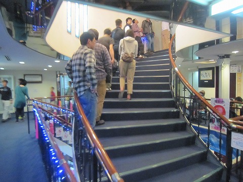 18:51 かなり待つ 船内に入ると、レストランに並んでいる列は階段の途中までつながっていました。 この辺りまで並ぶと、かなり待たされそう。 繁忙期は、少し早めに並ぶことをお薦めします。 |