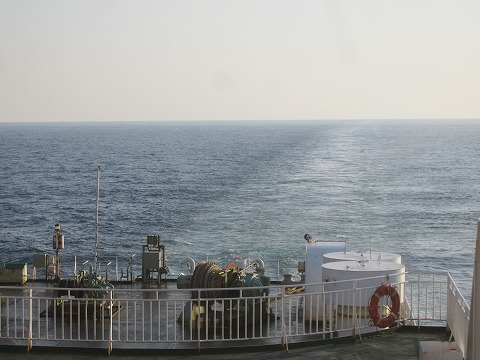 6:37 順調 辺り風も無く、外洋にもかかわらず波もほとんどありません。 昨日、大阪に向かう途中、東名高速道路から見えた海は強風で白波が立っていたのが嘘の様です。 船の後ろに回り込んで、後方を見ると、昨日の夕方とは違い航跡はかなり少なく速度を落としています。 順調に進み入港の時間を調整しているようです。 |