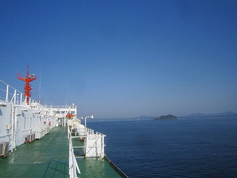 8:08 志布志湾に フェリーは志布志湾に入ってきました。 右舷に見えるのは、枇榔島(びろうじま)だそうで。 枇榔はヤシ科の植物の名前だそうです。 |