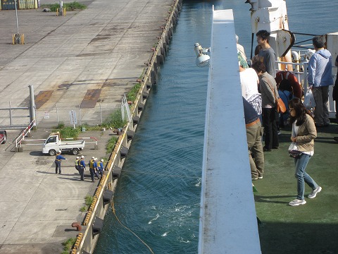 8:35 接岸準備 埠頭に近づき、接岸の準備。 フェリーからエアガンみたいなので先に重りが付いた先導ロープを埠頭に向けて発射。 埠頭の作業員6〜7名で先導ロープを引っ張り、その先に括り付けてある太い係留ロープを埠頭の係船柱(埠頭に生えている金属製のキノコみたいな形のやつ)に引っかけた後、フェリー側のウインチで係留ロープを巻き取って、フェリーを接岸させます。 |