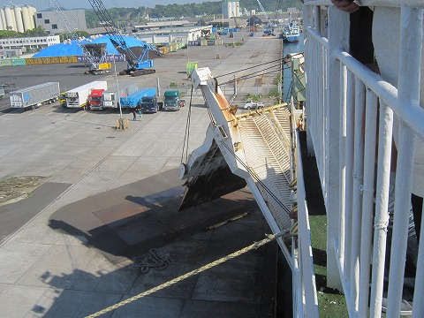 8:51 乗客の下船が始まりました 車両の下船より先に、タラップから徒歩で乗船したお客さんの下船が始まりました。 車両の下船は、乗船の時と同じ様に、トラックなどの仕事のクルマが優先。 船底近くの2階に駐車した自分のバイクは乗降甲板の4階のクルマが出てからなので、まだしばらく声がかかりそうもありません。 |